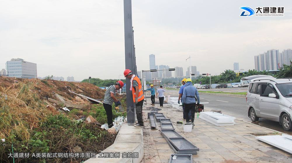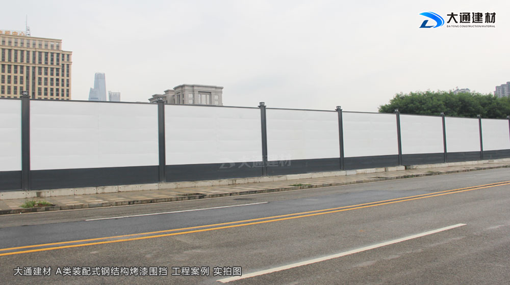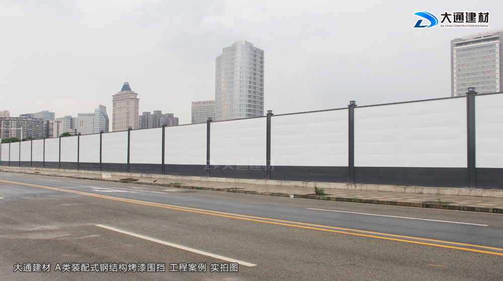 深圳市大通建材有限公司在東莞設有大型圍擋生產基地,是專業生產東莞市政標準圍擋的廠家,大通建材施工圍擋A采用鋼結構框架式結構,立柱采用國標型鋼,圍擋板采用1.2mm厚 的白色+灰色烤漆鋼板拼裝。圍擋核心受力關鍵點由立柱、斜支撐、橫撐加強筋共同組成,三重受力,預防圍擋傾倒,通過受力模型計算,抗風等級≤10級,抗剪強度、抗彎強度、穩定性更強,已應用于東莞茶山鎮施工項目。