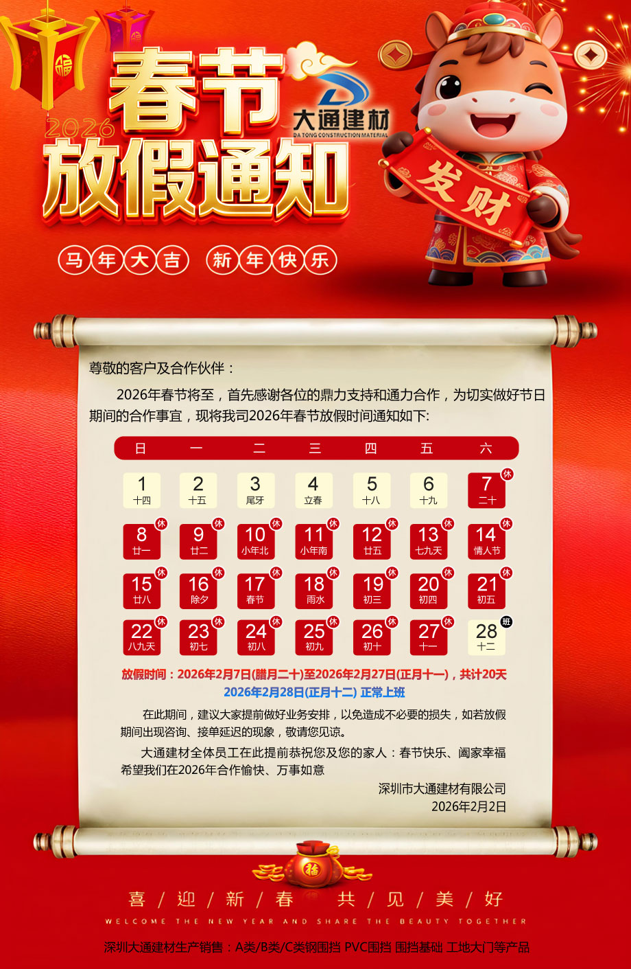 大通圍擋為您解答關(guān)于“深圳市大通建材有限公司“2026年春節(jié)”放假通知”相關(guān)問題?