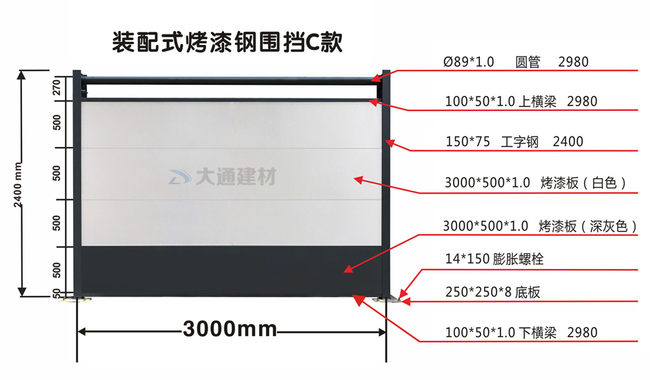 深圳市大通建材有限公司是一家專業(yè)的裝配式C類烤漆板鋼結(jié)構(gòu)圍擋生產(chǎn)批發(fā)源頭廠家,鋼圍擋品質(zhì)有保障,安全穩(wěn)固,廠家直銷 沒有中間商賺差價(jià),批發(fā)價(jià)格低于同行10%,貨源充足,常規(guī)規(guī)格下單后即可送貨安裝;特殊要求可以來樣或來圖定制生產(chǎn),有專業(yè)生產(chǎn)團(tuán)隊(duì),能快速生產(chǎn)出符合您需求的烤漆圍擋,大通建材鋼結(jié)構(gòu)烤漆圍擋,值得你選擇與信賴。咨詢?cè)斍榧翱焖佾@取報(bào)價(jià) 請(qǐng)致電13826562448 加微信號(hào)dt13826562448