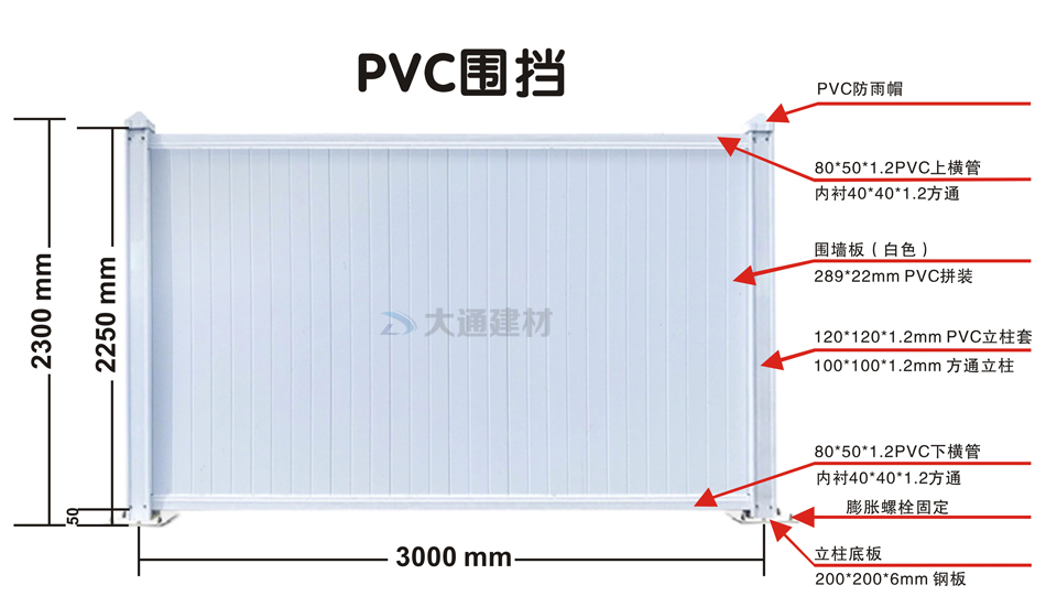 深圳市大通建材有限公司生產的PVC圍擋規格:長3米,高2米,立柱和橫梁里面內襯方鋼,具有水平邊緣和白色。圍護體的總高度為2.2 m,柱心間距為3m,立柱底座應設置一個支座,基座為四個混凝土砌塊,在擋土部分的繪圖中詳細說明了具體的規格和尺寸,禁止磚的使用;圍護結構的下腳涂漆成黃色和黑色的交通安全斑馬線,斑紋高度200 mm,寬150 mm,傾角45°,與車輛方向的斜角點。具體如下圖展示: