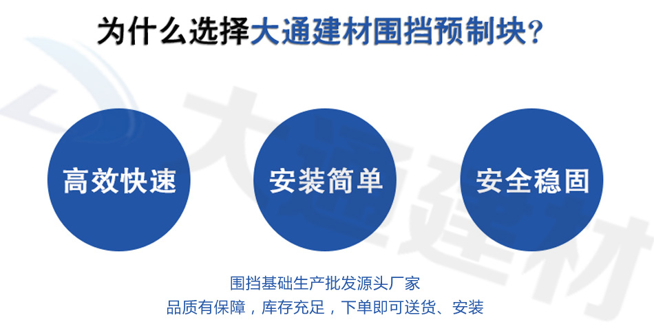 然后我們再來看看塊狀圍擋基礎(chǔ)預制塊的優(yōu)點是不僅抗傾覆穩(wěn)定性好,不易發(fā)生傾覆,強度高,剛度大,安全穩(wěn)固,且常規(guī)尺寸的塊狀圍擋基礎(chǔ)預制塊有現(xiàn)貨,下單即可以發(fā)貨、同時運輸方便,拆裝方便、還能多次周轉(zhuǎn)使用,即方便又節(jié)約成本。