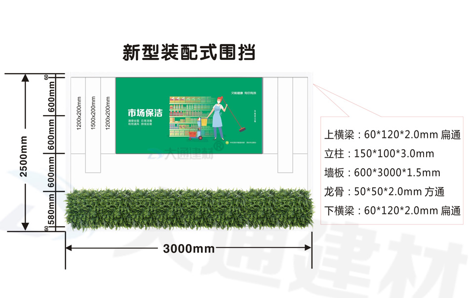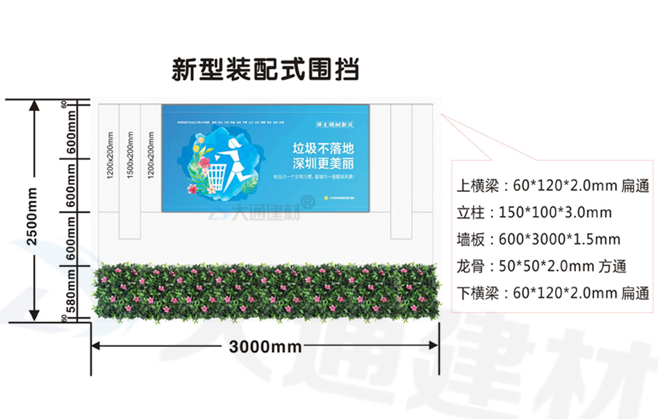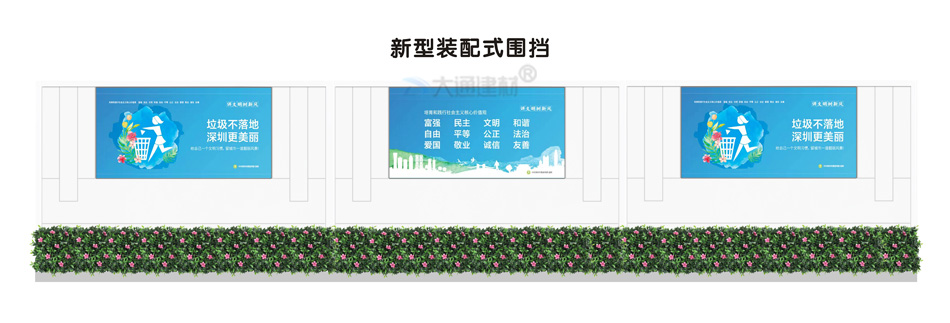 深圳市大通建材生產的 新型裝配式圍擋+高檔綠植圍擋,符合深圳市住建局統一要求的圍擋標準,常規尺寸的圍擋有現貨,而對圍擋尺寸、顏色等有特殊要求的可按實際需求定制化生產,了解更多“大通圍擋規格與價格”的詳情 請致電咨詢 13826562448 梁先生